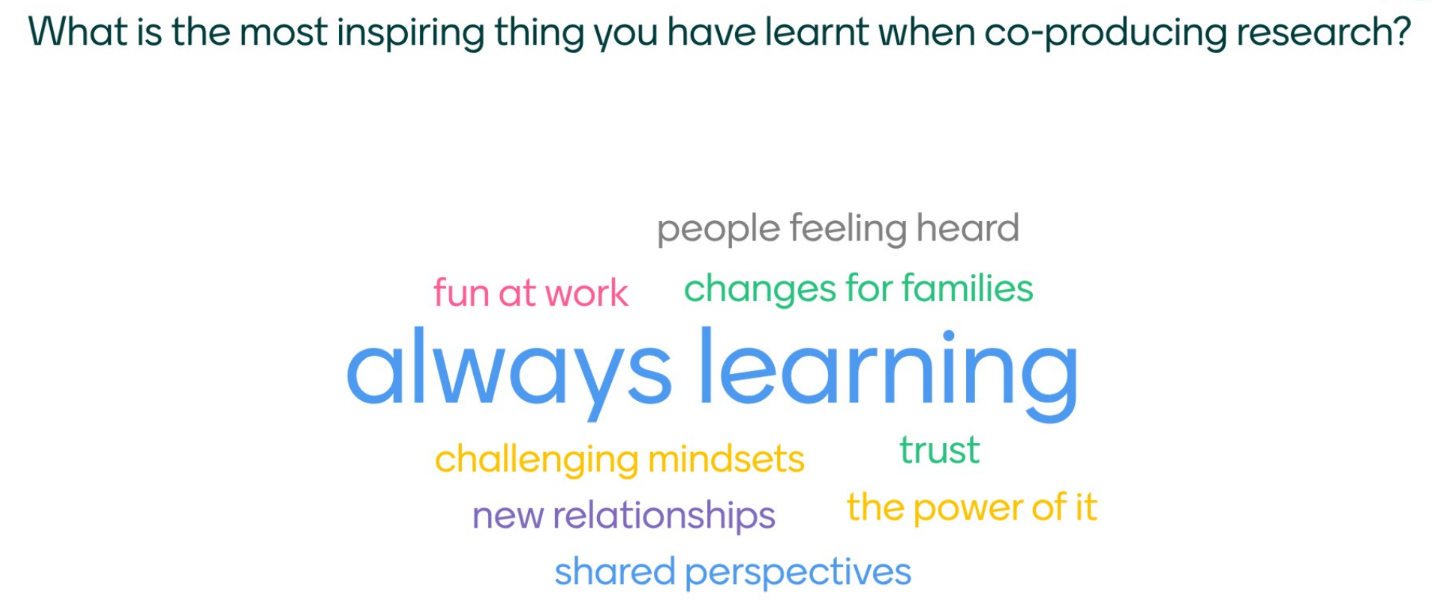 Responses to the question ‘What is the most inspiring thing you have learnt when co-producing research?’ are shown in the word cloud below: